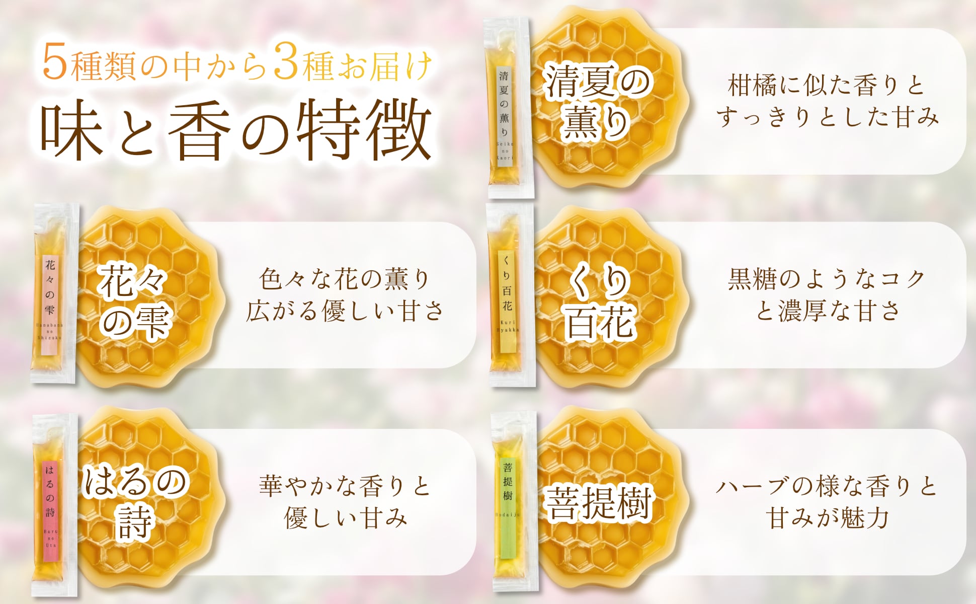 ※本商品は、5種類のはちみつの中からランダムに3種類をお詰めしております。各はちみつの種類の供給状況により、一部ご用意が難しい場合がございますため、ランダムでのご提供とさせていただいております。